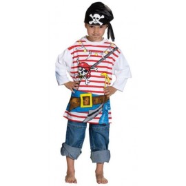 Ce déguisement garçon comprend : un haut marron style veste en tissu à manches longues, tee-shirt imprimé attaché à la veste en tissu, un pantalon marron en tissu taille élastiquée, une ceinture bandoulière marron, un chapeau de pirate marron en tissu avec ruban rouge attaché.
