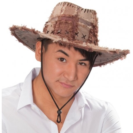 Chapeau cowboy patchwork adulte : ce chapeau cowboy patchwork adulte est marron en tissu avec cordon d'attache, accessoire déguisement cowboy homme et femme parfait pour un anniversaire, carnaval, fêtes déguisées, thème country, cowboy, Farwest, western.