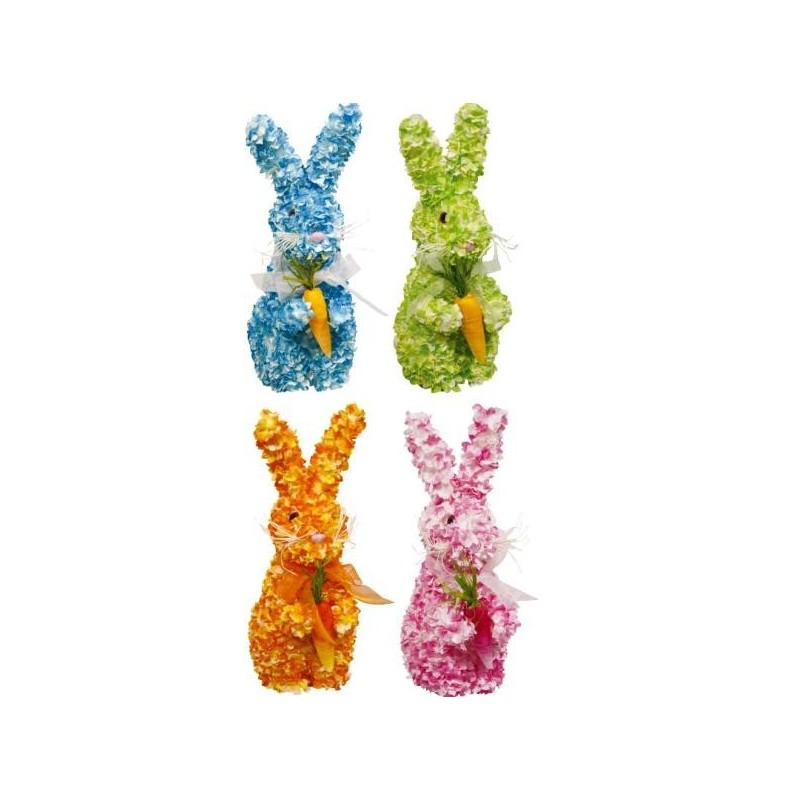 Superbe Lapin aux Mélanges de Matières qui tient une carotte, Lapin avec ses moustaches en raphia blanc, recouvert de petites fleurs et orné d'un joli Noeud en Organdi Blanc autour du cou, Lapin Couleur en polystyrène et petites fleurs en papier.